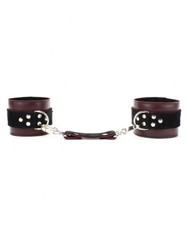 Оковы выполнены из натуральной кожи. Изделие декорировано ремнями из замши. Посредине аксессуара расположено полукольцо из сварной фурнитуры. Оковы надежно фиксируются пряжками и ремнями, позволяющими выбрать нужный размер, кожаное соединение на карабинах фиксирует оковы вместе. Стильный аксессуар отлично подходят для воплощения эротических БДСМ игр.