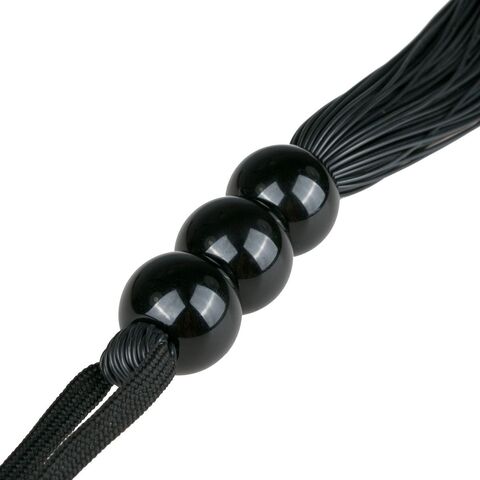 Аккуратная плеть черного цвета с рукоятью. Она сделана из силиконовых шнуров. Рукоять состоит из пластиковых круглых бусин. Если Вам нужны новые ощущения во время любовных игр, Вы можете использовать эту мягкую плеть. Найдите баланс между поглаживанием и ударами, и этот опыт, безусловно, принесет опыта и удовольствия в вашу сексуальную игру. Удобная эластичная петля на рукояти гарантирует, что хлыст не выскользнет из вашей руки во время его использования. Длина шнуров - 27 см.