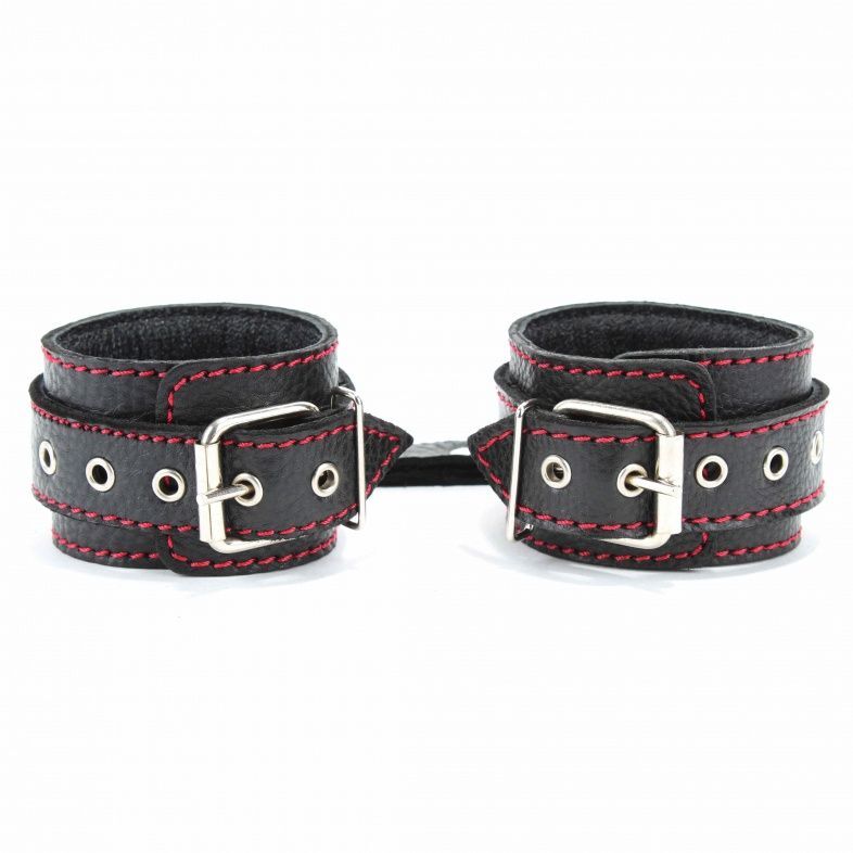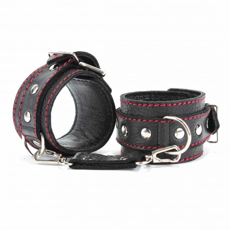 Оживить эротические игры Вам помогут поножи. Этот интимный аксессуар пользуется успехом. Выполненные в черном цвете с красной строчкой и декорированы заклепками. Модный интимный аксессуар не сдавливает и не нарушает кровообращение, так как изготовлен из мягкой кожи. Чтобы любимая никуда не убежала, поножи соединены короткой перемычкой. Длина перемычки - 6 см. Ширина оков - 6 см.