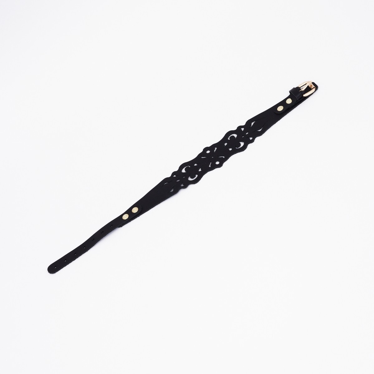 Чокер с узорным дизайном из натуральной кожи с золотой фурнитурой. Резные элементы придают атмосферу нежности, элегантности и подчеркивают красоту тела. Регулируется ремешком, поэтому прекрасно будет смотреться на любой шее. Доставляется в фирменной упаковке в виде брендированной деревянной подложки. Ширина основы - 5 см. Обхват - 32-40 см.