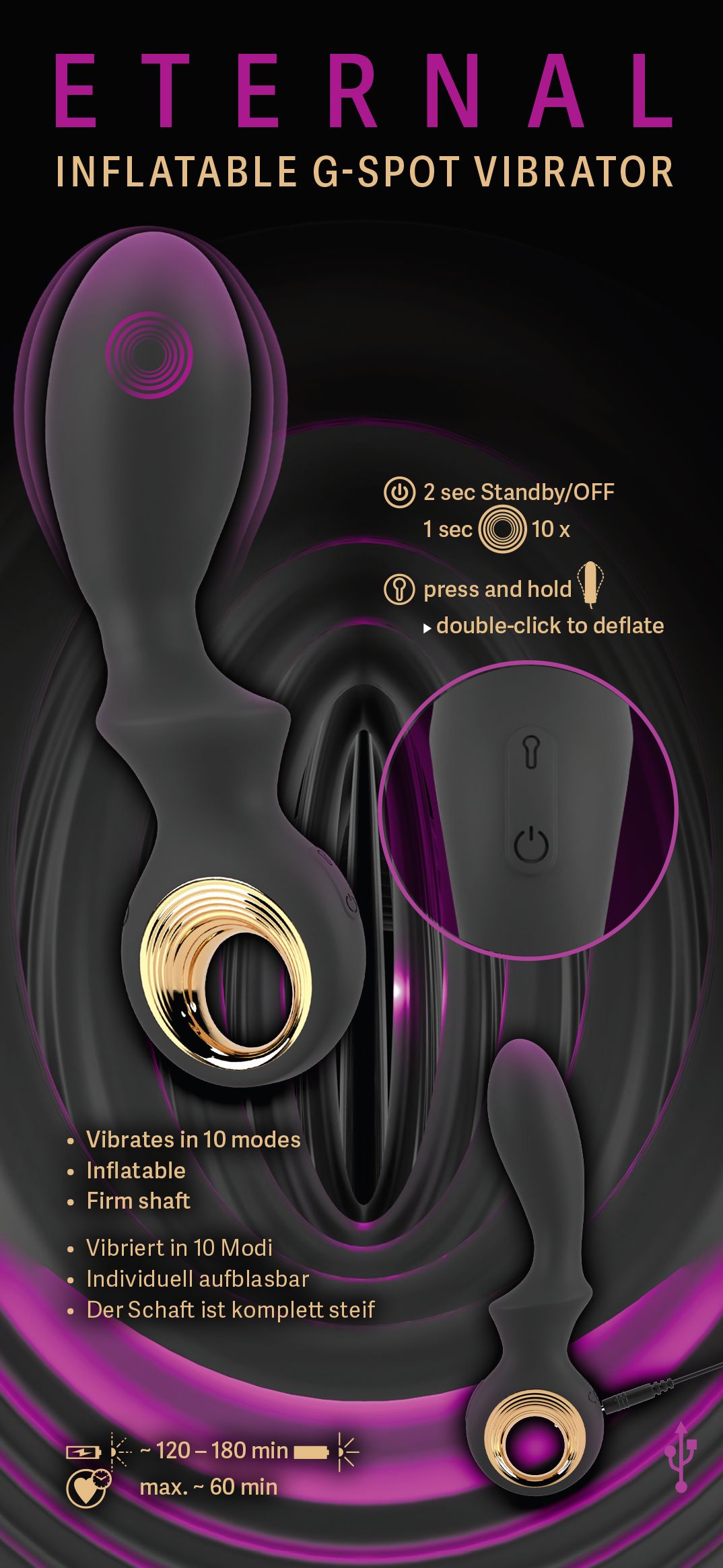 Компактный вибратор с надувным кончиком идеально стимулирует вагинальную точку G и простату. Изогнутый корпус с шелковисто-мягкой текстурой Soft Touch легко вводится и скользит без усилий. Два тихих мощных мотора обеспечивают 10 режимов вибрации в утолщенном наконечнике и автоматическую функцию надувания с предохранительным клапаном. Нескользящее кольцо обеспечивает безопасное использование. Перезаряжаемый — USB-кабель в комплекте. Рабочая длина - 10 см. Максимальный диаметр после надувания - 4,7 см.