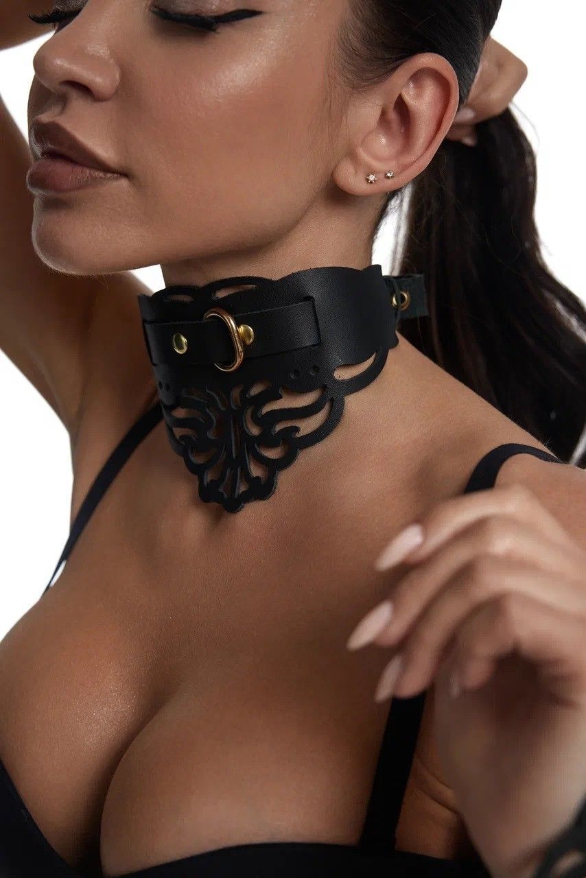 Чокер фигурный из натуральной кожи, украшенный узорами. Каждый элемент дизайна тщательно проработан, чтобы подчеркнуть красоту и элегантность изделия. Золотая фурнитура, сверкающая на фоне черной кожи, добавляет утонченности и изысканности. Доставляется в фирменной упаковке в виде брендированной деревянной подложки.