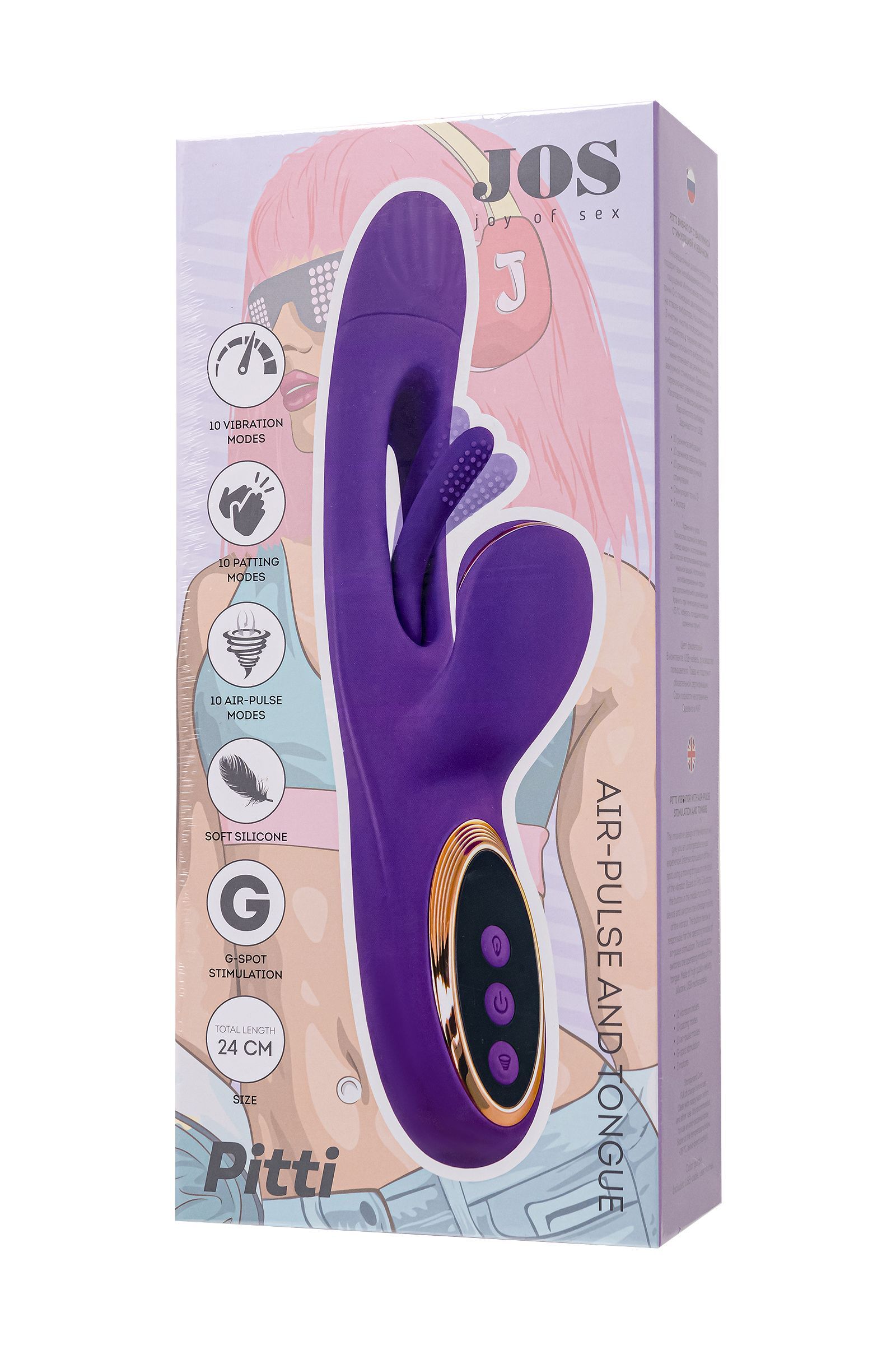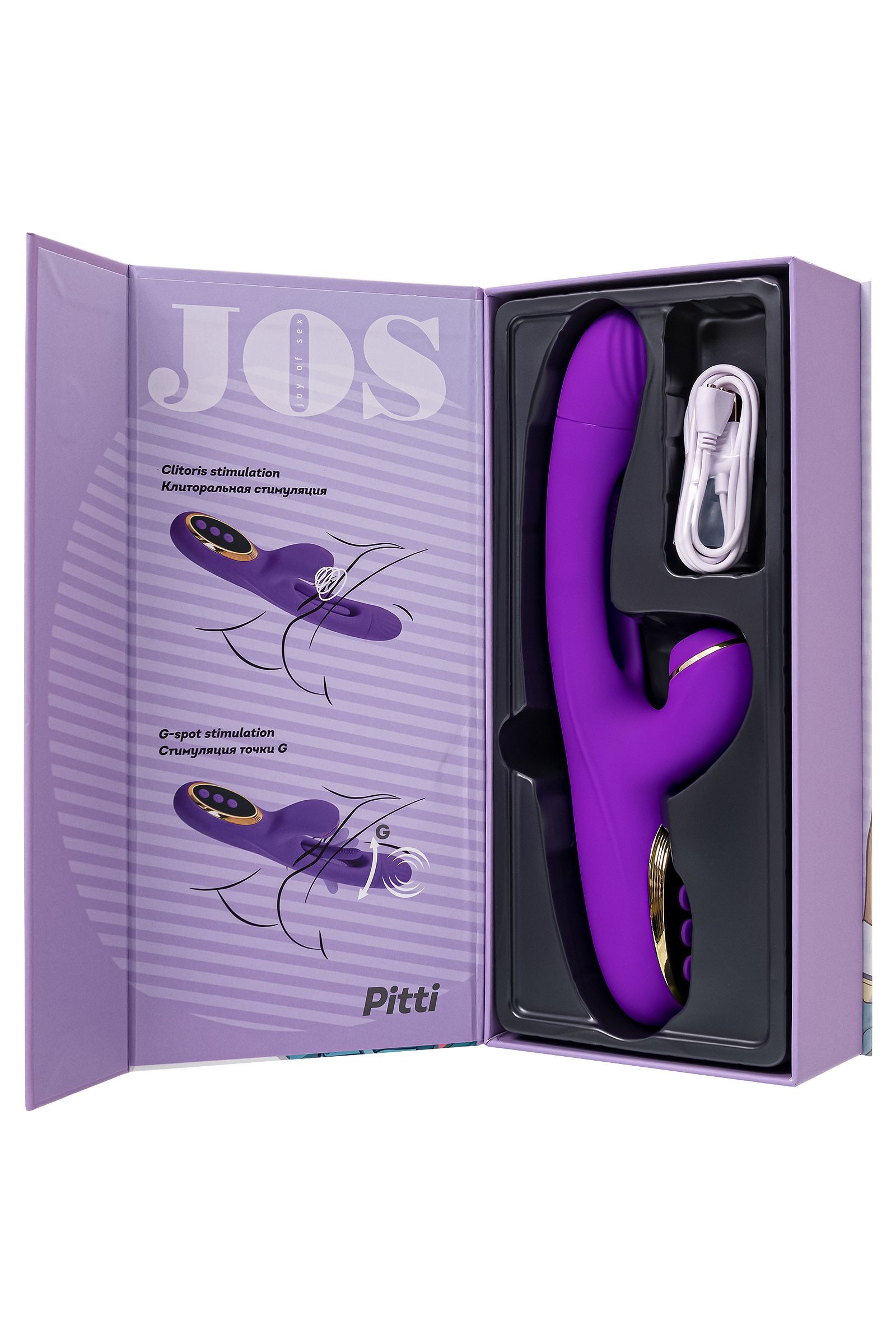 Погрузитесь в мир инновационных ощущений с вибратором Pitti от самого необыкновенного бренда JOS! Этот невероятный технологичный дизайн поднимет стимуляцию точки G на абсолютно новый уровень. Двигающийся язычок внутри вагинальной части точечно вибрирует непосредственно на зоне G, погружая вас в водоворот удовольствия. А клиторальный отросток в это время может ласкать вас вакуумными волнами воздушной пульсации. Тройное удовольствие гарантирует оргазм с максимальным уровнем экстаза. Управляйте своим наслаждением с легкостью! Три кнопки на основании вибратора контролируют каждый аспект удовольствия. Серединная кнопка включает устройство и переключает режимы основного вибратора. Кнопки ниже управляют режимами клиторального отростка. Верхняя кнопка изменяет режимы работы язычка. Pitti выполнен из высококачественного бархатистого силикона, обеспечивая максимальный комфорт. Заряжается от USB, что делает использование еще более удобным. Простое управление тремя кнопками гарантирует, что каждая функция будет под вашим контролем. Дизайн игрушки выполнен в насыщенном фиолетовом цвете с золотыми вставками. Изготовленный из высококачественного бархатистого силикона, Pitti легко заряжается от USB, что делает его современным и практичным в использовании. Идеально гладкое и безопасное покрытие обеспечит вашей коже комфорт. Рабочая длина - 13,5 см.