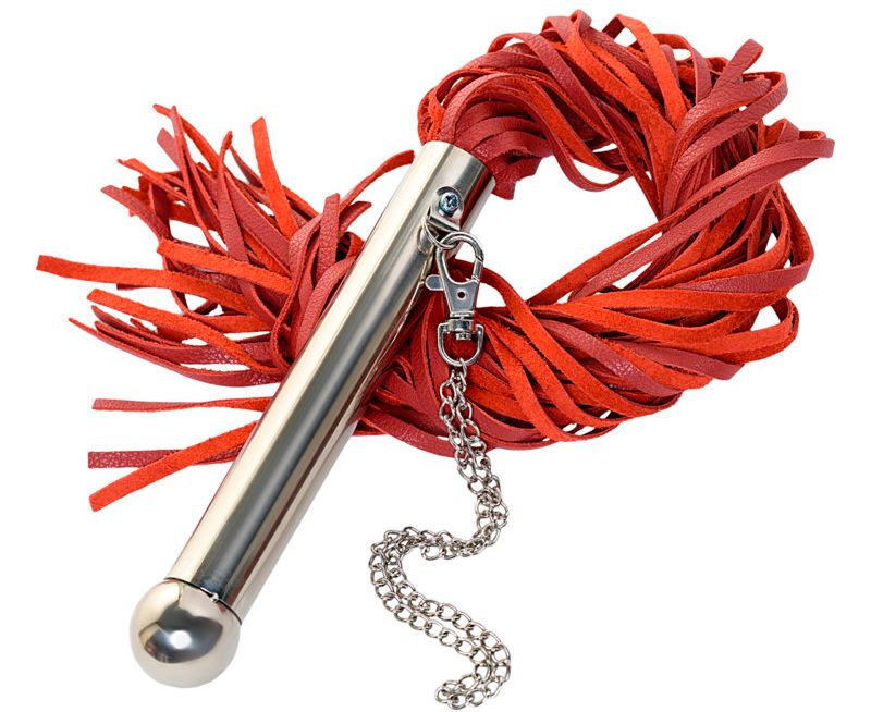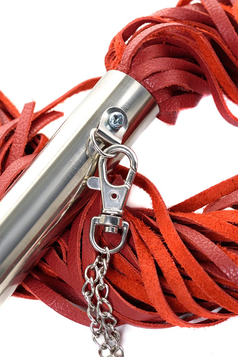 Стильная плеть из красной кожи с металлической рукояткой. Рукоятка с петлей - цепочкой. Предназначена для средних и сильных воздействий по разогретому телу партнера. Длина рукояти - 18 см.