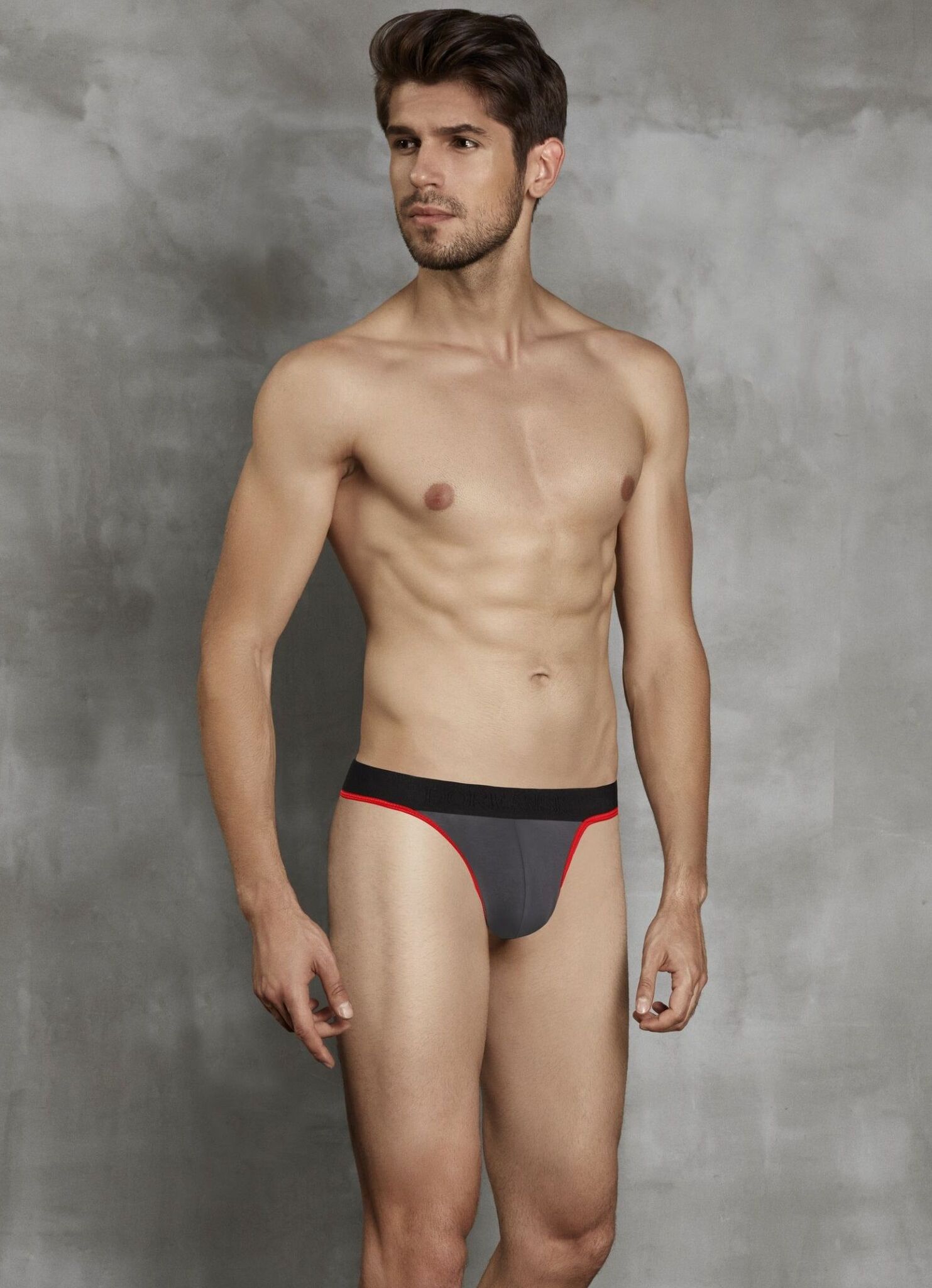 Мужские стринги на пришивной резинке от «Doreanse». Края передней панели, низ пришивной резинки и задняя лямочка украшены контрастным эластичным кантом. Передняя панель однослойная, без подкладки.