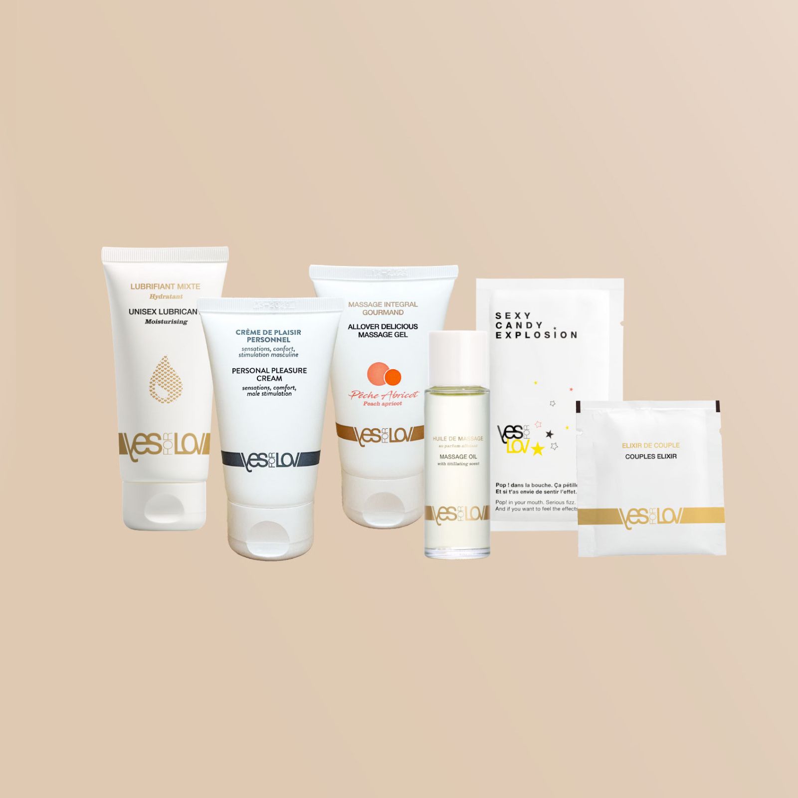 Внутри собраны средства для эротического массажа, деликатного ухода и совместных экспериментов: эликсир для пар, натуральная интимная смазка, крем для мастурбации, съедобный массажный гель с ароматом персика и абрикоса, чувственное массажное масло и взрывающаяся карамель для игры чувств. Объём большинства флаконов 30 мл, что удобно для дорожной косметички и даёт возможность спокойно протестировать каждый продукт. Средства ориентированы на комфорт, расслабление и мягкое увлажнение интимной зоны.