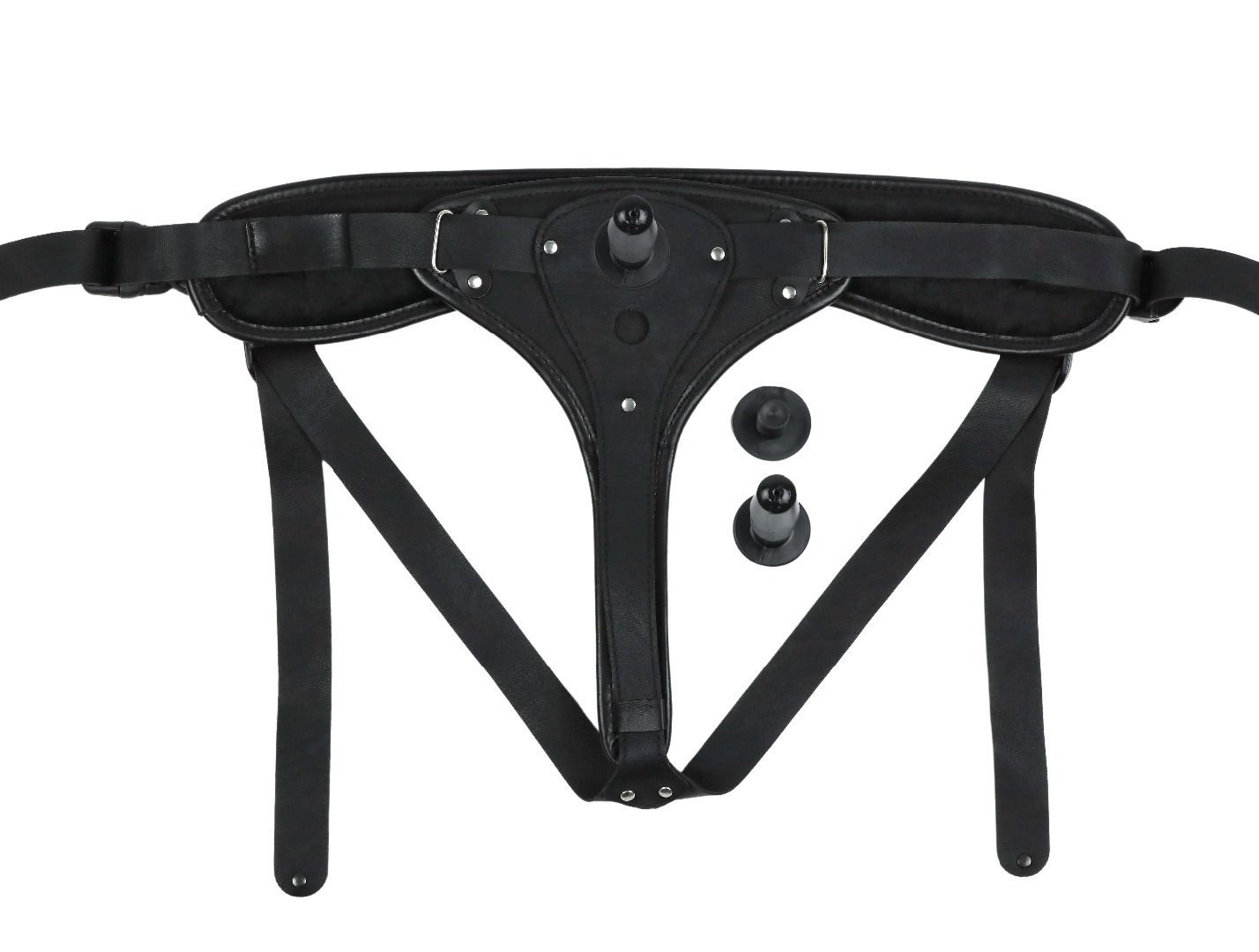 Комплект включает внутреннюю насадку из атравматичной кибер-кожи на каркасе, которая передает приятное давление на клитор и вход во влагалище, а также позволяет одновременно использовать анальную насадку. Две внешние насадки различаются по ощущениям: мягкая из материала неоскин с полужесткой основой имитирует эрегированный пенис, а компактная полужесткая насадка в черно-серебристом цвете добавляет разнообразие. Классический пояс в стиле БДСМ имеет мягкую окантовку, вспененный слой между кожей и удобные боковые фастексы, благодаря чему конструкция плотно и комфортно фиксируется на теле и не требует постоянной перенастройки.
