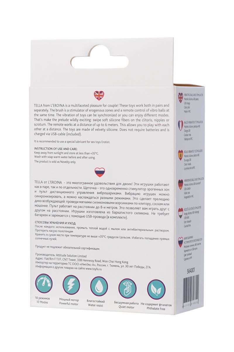 TELLA от LEROINA — это многогранное удовольствия для двоих! Эти игрушки работают как в паре, так и по отдельности. Щеточка — это одновременно стимулятор эрогенных зон и пульт дистанционного управления виброшариками. Вибрацию игрушек можно синхронизировать, а можно наслаждаться разными режимами. Это сделает прелюдию дико возбуждающей: проведи мягкими силиконовыми ворсинками по клитору, соскам или мошонке. Пульт работает на расстоянии до 8-и метров. Это позволяет вам играть друг с другом на расстоянии. Игрушки изготовлена из бархатистого силикона. Не требует батареек и заряжается с помощью USB-провода (в комплекте).