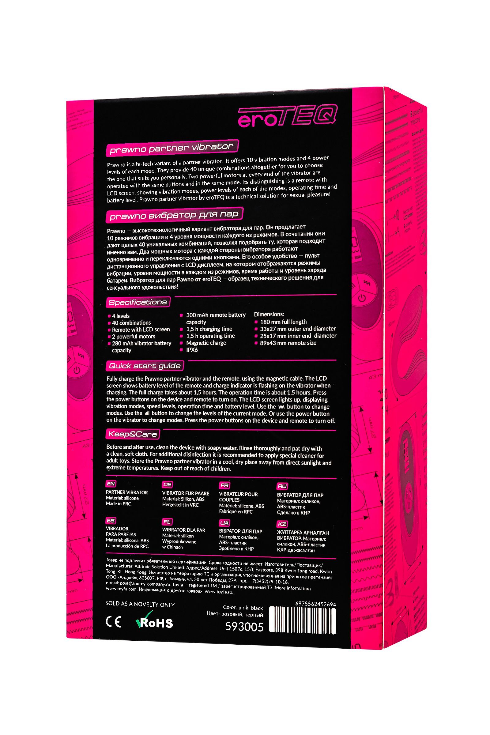 Откройте для себя инновационный мир интимных удовольствий с Prawno от eroTeq — высокотехнологичным вибратором для пар, который подарит вам незабываемые моменты близости. С 10 режимами вибрации и 4 уровнями мощности, Prawno предлагает целых 40 уникальных комбинаций для настраиваемого удовольствия, позволяя вам и вашему партнеру найти идеальный режим для каждого настроения и момента. Prawno имеет форму скобы (U-образный дизайн), где меньшая часть вставляется во влагалище, обеспечивая стимуляцию зоны G и пениса партнера, в то время как большая часть накрывает зону клитора, даря двойное удовольствие. Такой дизайн позволяет вибратору одновременно стимулировать несколько эрогенных зон, усиливая ощущения обоих партнеров и делая каждый момент максимально насыщенным. Особенность Prawno — два мощных мотора, синхронно работающие с обеих сторон устройства. Это гарантирует равномерную и мощную стимуляцию, управление которой осуществляется одной кнопкой, что делает использование простым и интуитивно понятным. Пульт дистанционного управления с LCD дисплеем предоставляет полный контроль над всеми функциями устройства: от выбора режимов до мониторинга времени работы и уровня заряда батареи. Prawno водонепроницаем по стандарту IPX6, что позволяет наслаждаться им даже в душе или ванной, добавляя разнообразие в ваш интимный досуг. Этот вибратор станет идеальным спутником для тех, кто стремится к новым ощущениям и инновационным решениям в личной жизни.