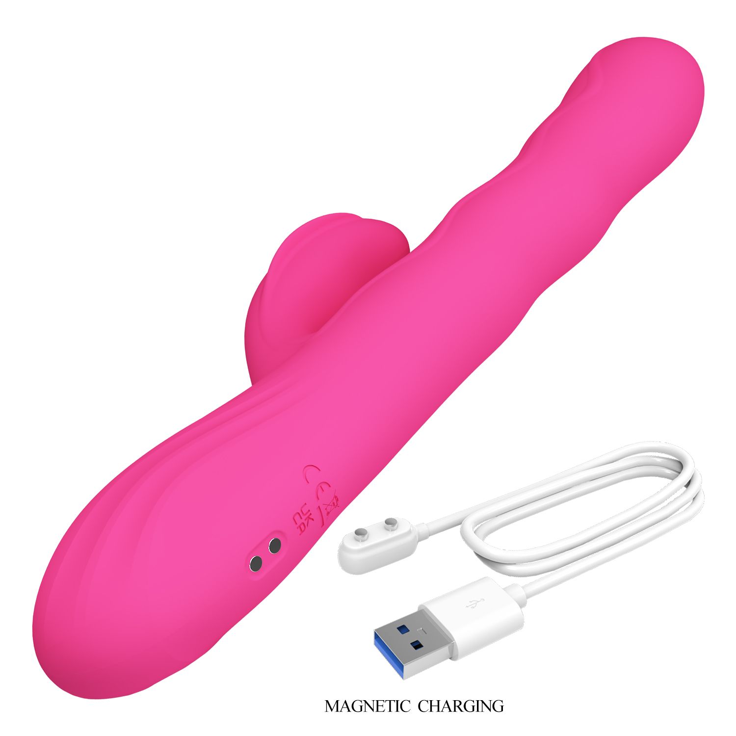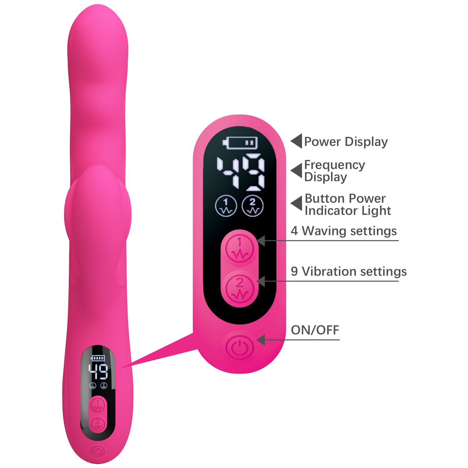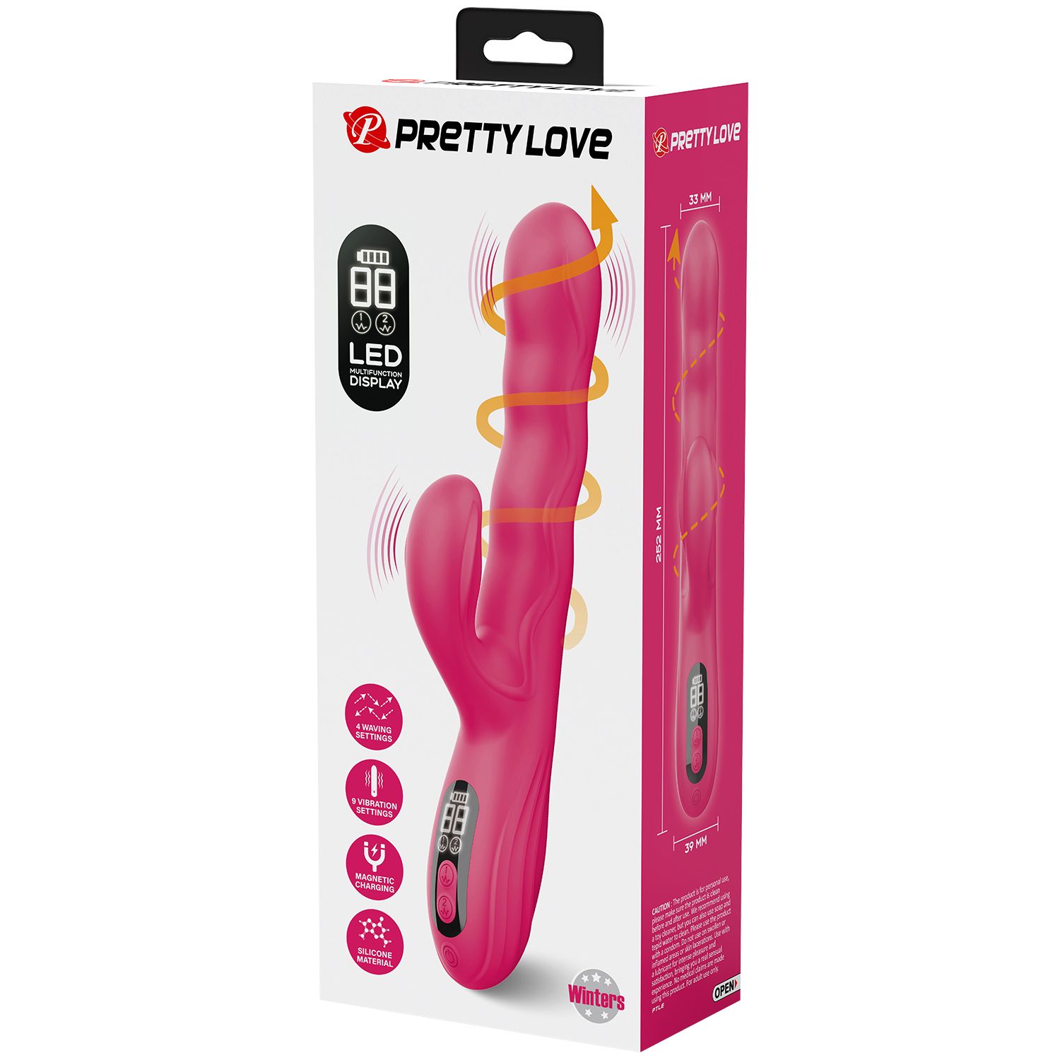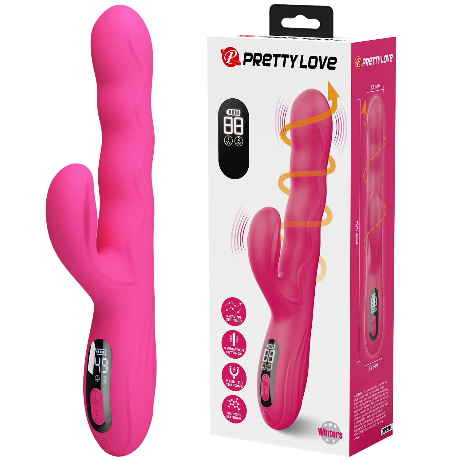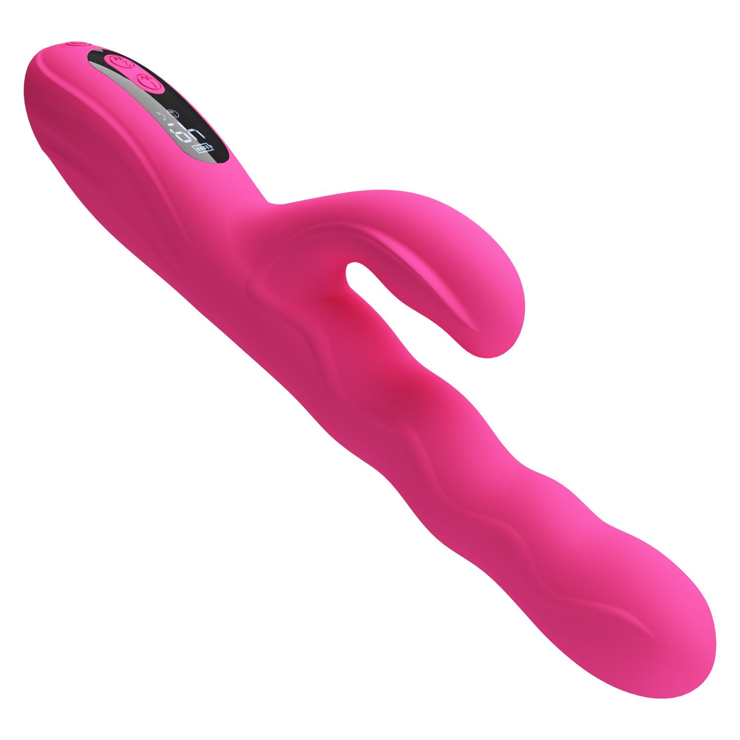 Розовый вибростимулятор-кролик с волновыми движениями Winters. 9 режимов вибрации, 4 режима волн. LED-дисплей. Рабочая длина - 14 см.