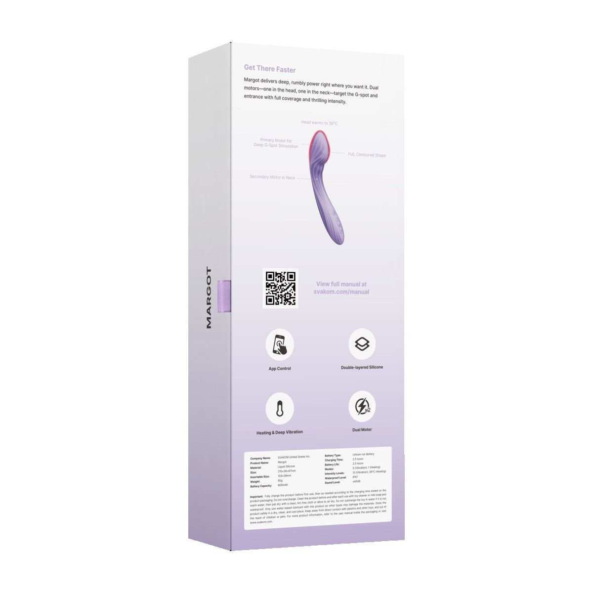 Сиреневый интерактивный вибростимулятор Margot от Svakom создан для точной и деликатной стимуляции точки G и вагинальных ощущений. Он подойдёт тем, кто ценит глубокие вибрации, мягкий контакт с телом и современные технологии с управлением через приложение.