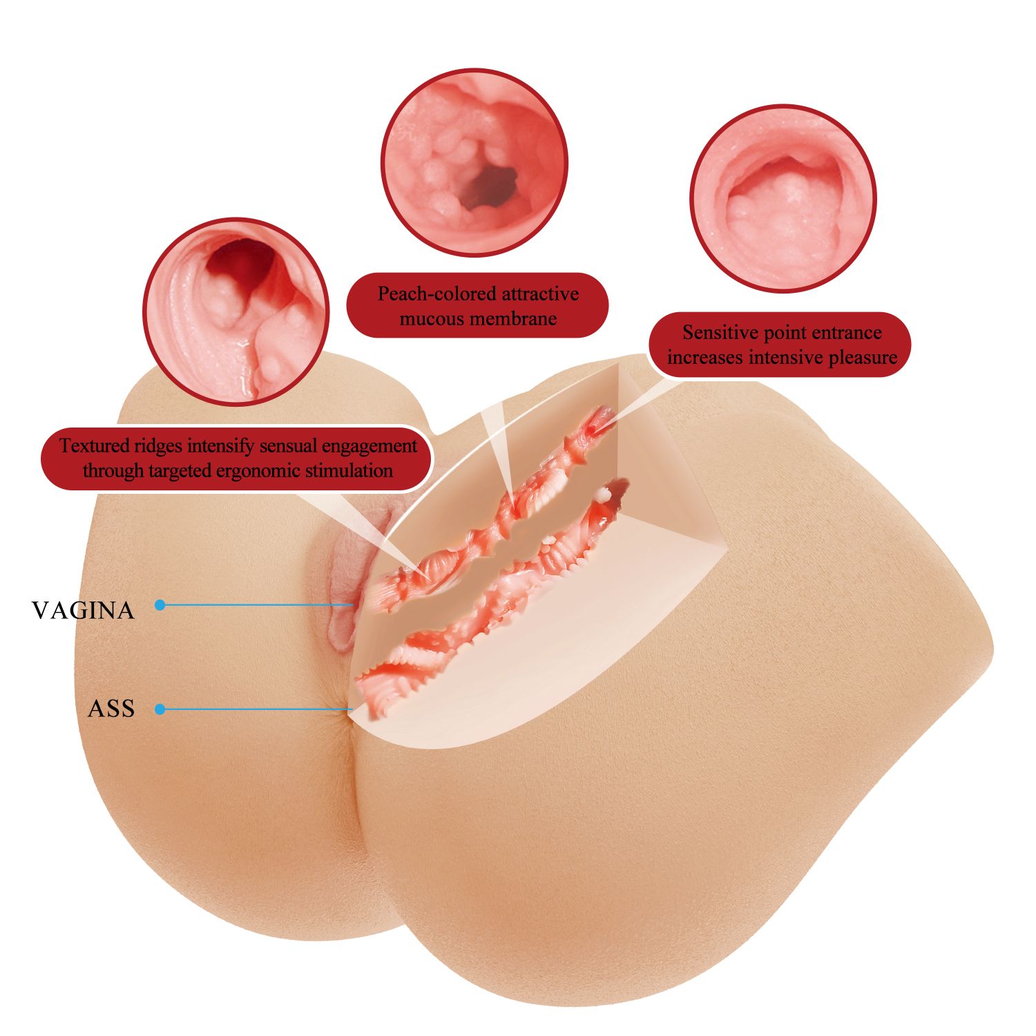 Мастурбатор предлагает два независимых входа – вагину и попку, каждый со своей текстурой и характером ощущений. Встроенная вибростимуляция с 10 режимами усиливает каждое движение, а интимные звуковые эффекты добавляют атмосферы и создают ощущение живого отклика. Реалистичная слизистая персикового оттенка, акцент на чувствительной точке у входа и рельефные стенки тоннелей обеспечивают насыщенное, целенаправленное воздействие. Мягкая термопластичная резина (TPR) приятна на ощупь и безопасна для тела, а водонепроницаемый корпус упрощает уход и позволяет использовать игрушку в душе.